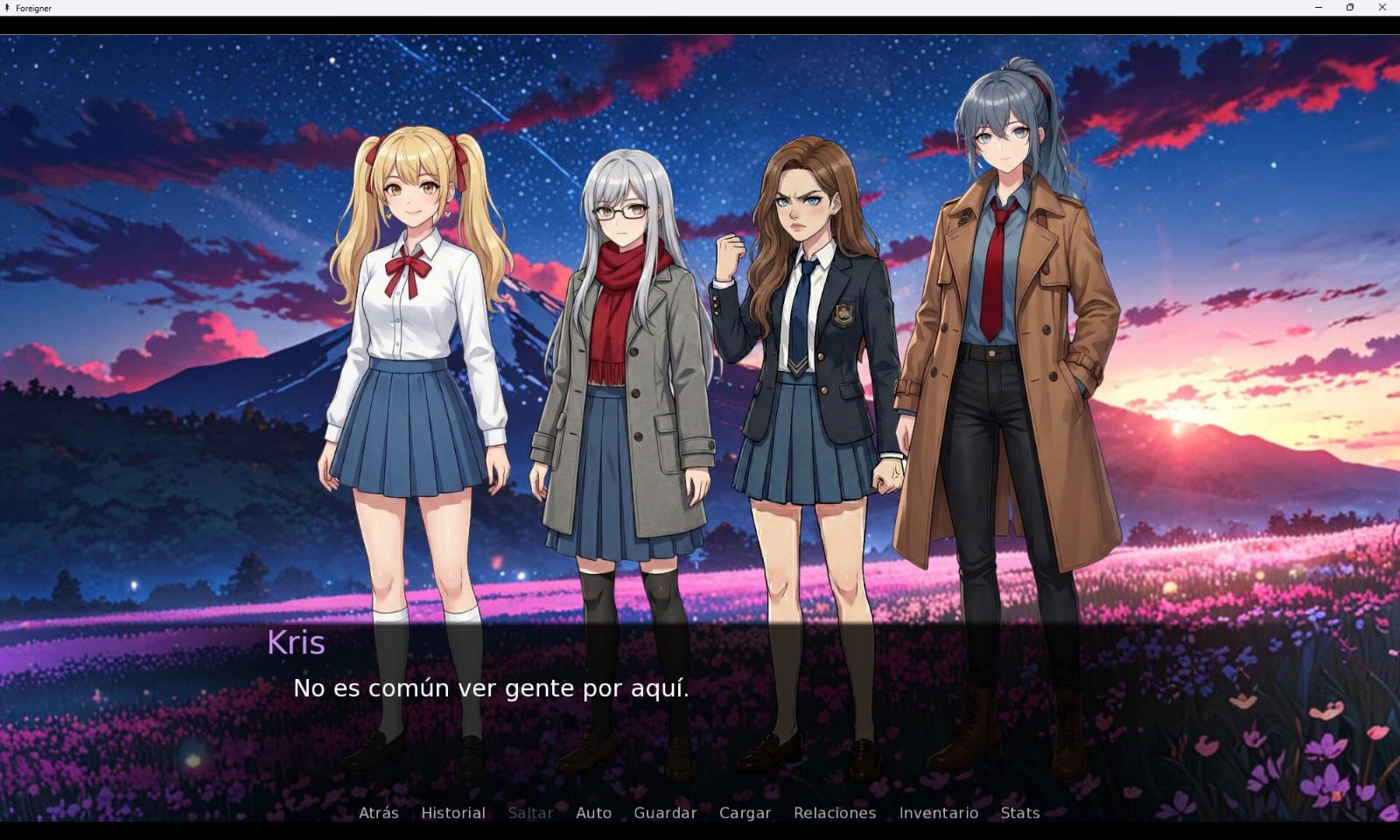Foreigner es una novela visual de misterio y horror donde cada noche presencias mundos destruidos… Contiene además combate por turnos con un toque de RPG. En el día a día, fortaleces lazos con tus amigas y tomas decisiones que afectan tus relaciones y tus posibilidades de sobrevivir a lo que viene.