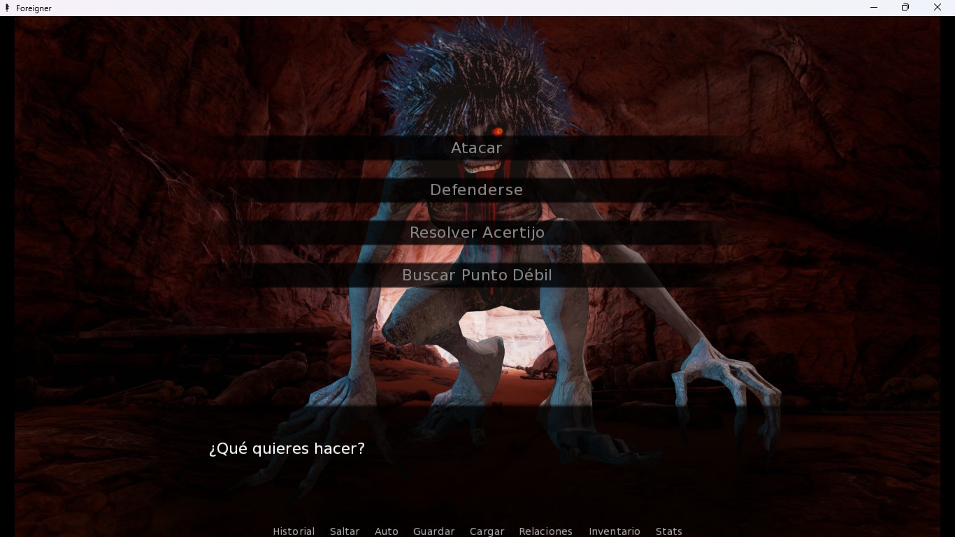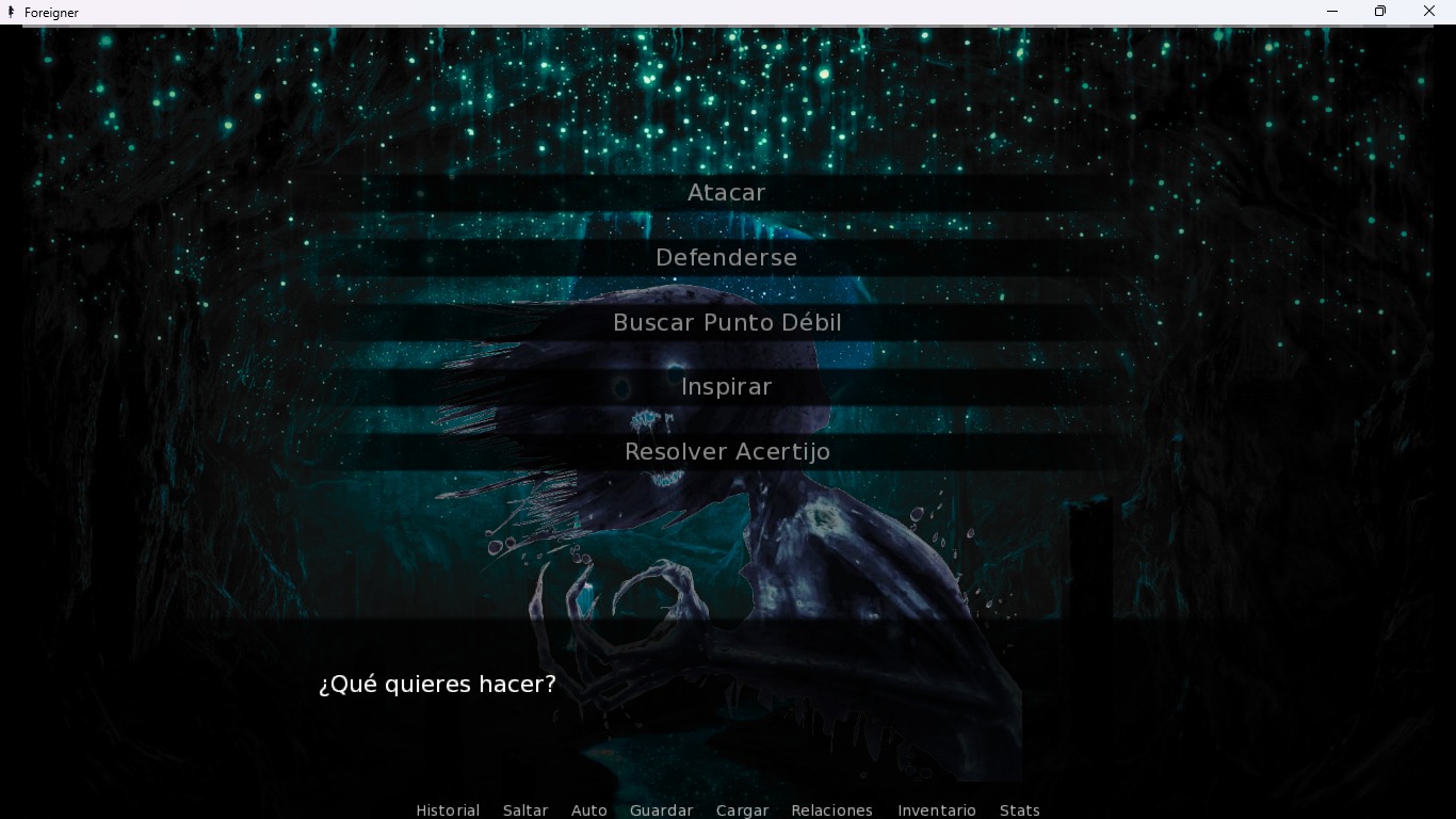 - Menú inferior: historial, guardar/cargar, relaciones, inventario, stats (según progreso).